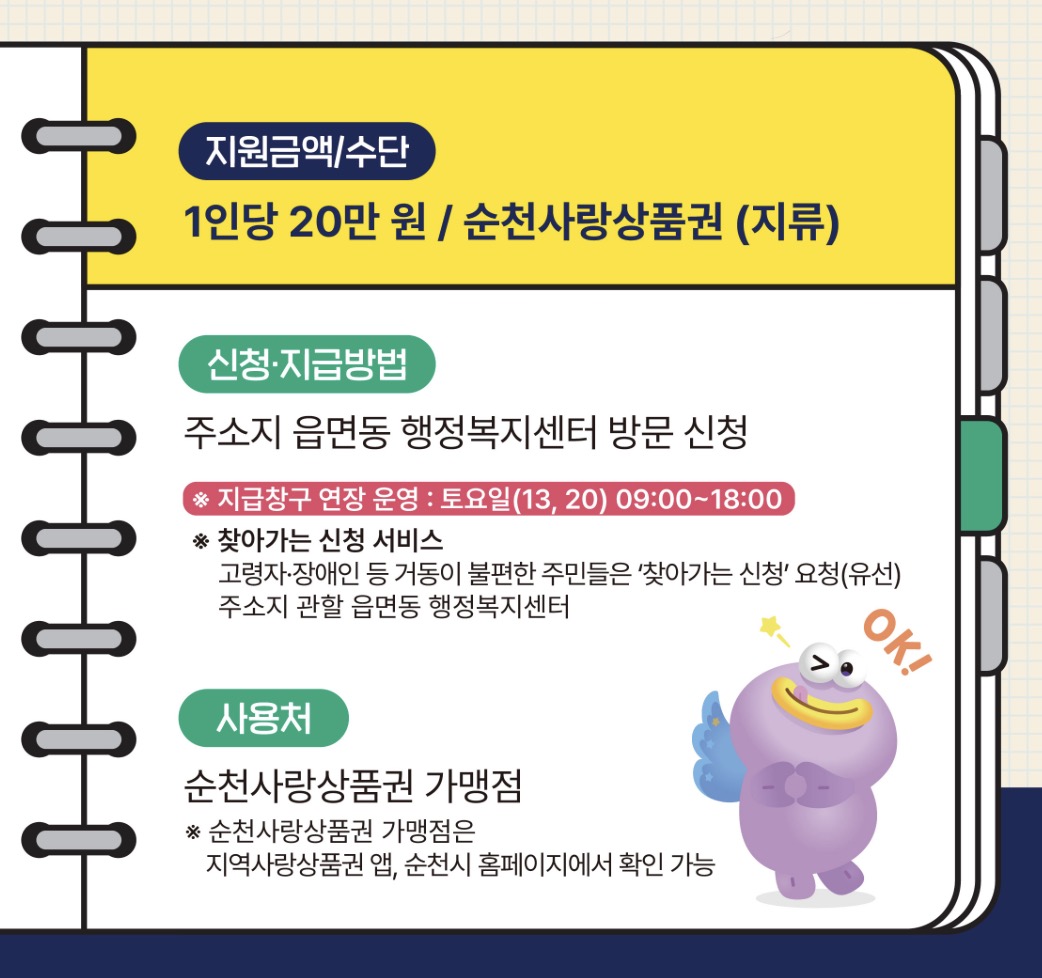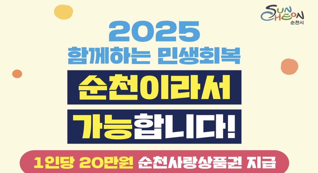 - 지급 방식: 지역화폐인 순천사랑상품권 (지류 또는 모바일)으로, 지역 소비 활성화와 골목상권 보호를 동시에 노린 정책입니다.