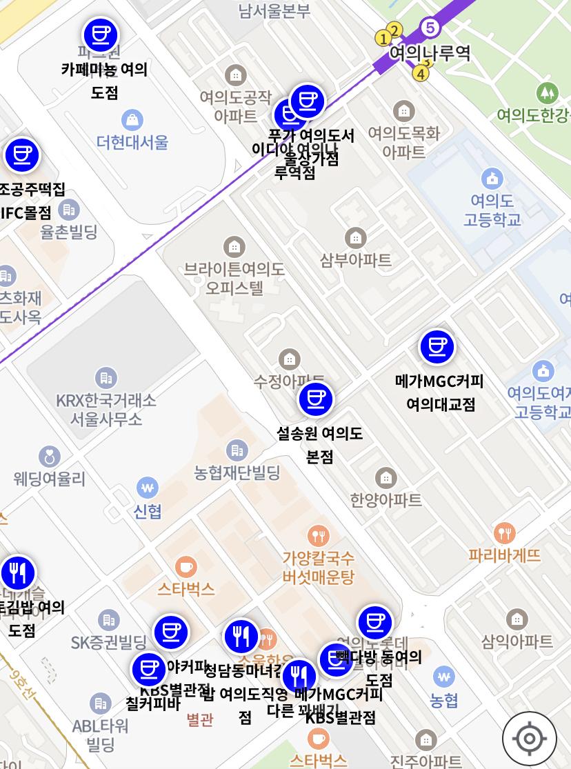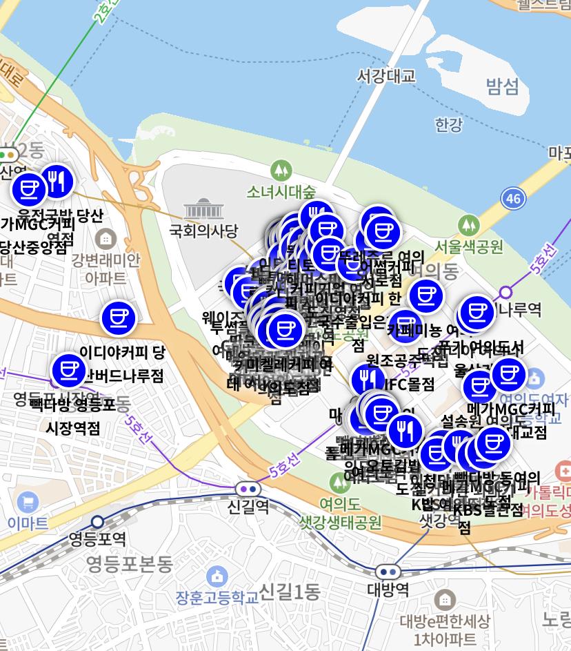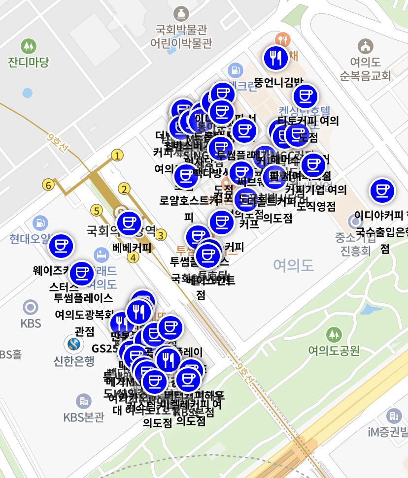 12월 13일 오전 8시 기준 여의도 국회의사당 인근 A카페에는 아메리카노 100개, B카페에는 아메리카노 50개 등이 표시되었습니다.