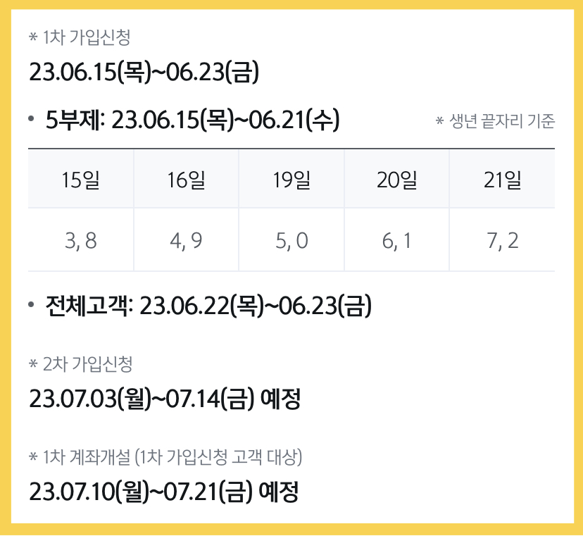 - 1차 계좌개설(1차 가입신청 고객 대상): 2023년 7월 10일(월)~7월 14일(금) 예정