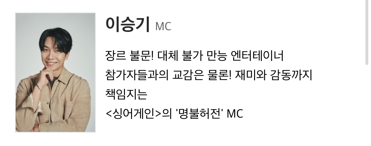 싱어게인4의 MC는 이승기입니다. 장르불문 대체 불가 만능 엔터테이너로 참가자들과의 교감과 재미, 감동까지 책임지는 싱어게인의 명불허전 MC로 주목받고 있습니다.