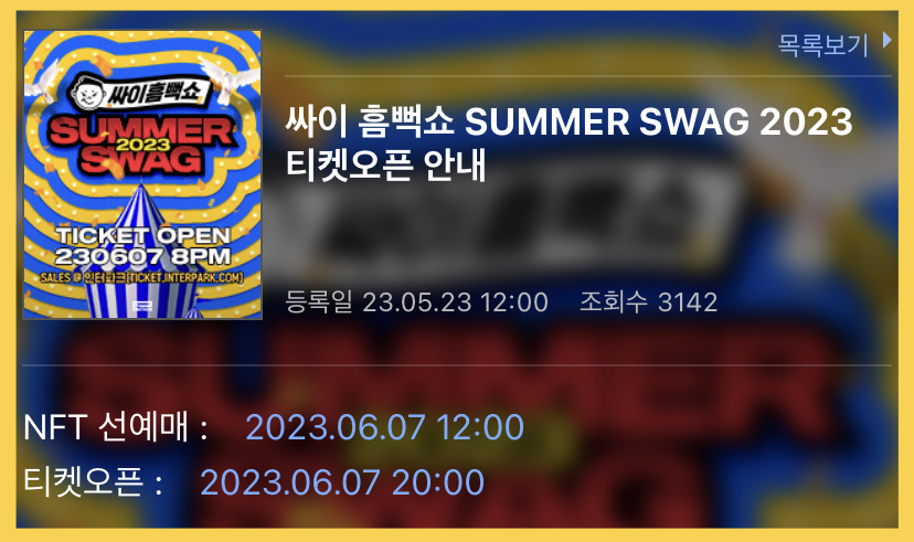 또한, 2023 싸이 흠뻑쇼 예매 일정은 일반 예매와 NFT 선예매가 있는데요. NFT 선예매는 6월 7일 오후 12시부터이고, 일반 예매는 6월 7일 오후 8시부터입니다. 일반예매가 8시간 늦습니다.