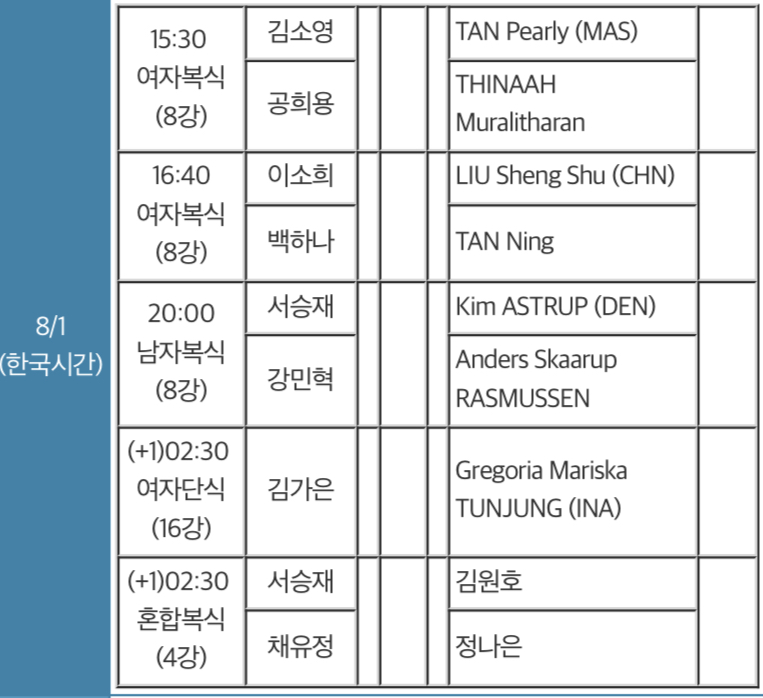 8월 1일 배드민턴은 오후 3시 25분에는 여자 복식 8강에 나서는 김소영-공희용, 백하나-이소희의 경기에 이어 오후 7시 55분부터는 남자 복식 8강에 출전한 강민혁-서승재의 경기가 펼쳐집니다.
