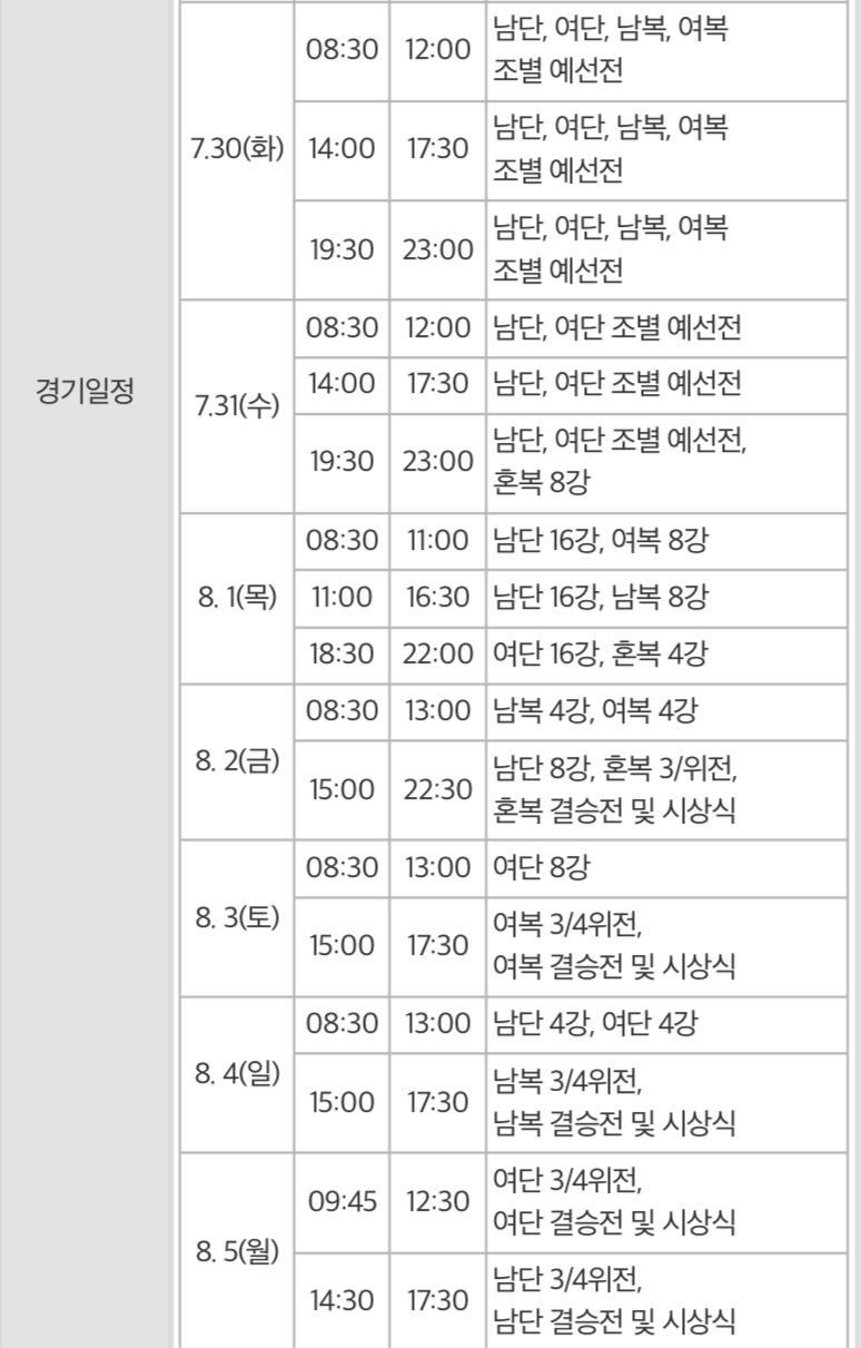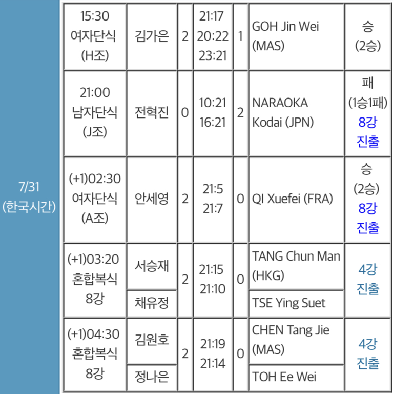 7월 31일 배드민턴 경기 일정