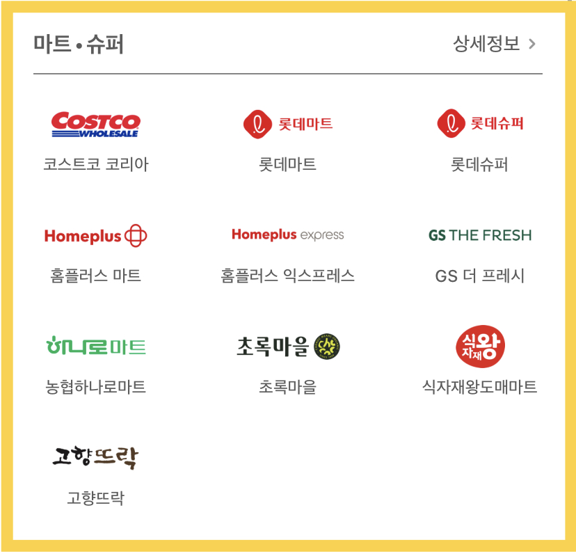 코스트코 코리아, 롯데마트, 롯데슈퍼, 홈플러스 마트, 홈플러스 익스프레스, GS 더 프레시, 농협하나로마트, 초록마을, 식자재왕도매마트, 고향뜨락