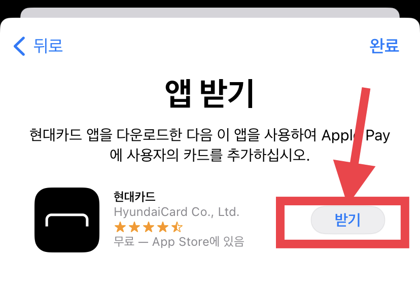 현대카드 앱이 없는 경우 현대카드 앱을 앱스토어에서 받아 설치합니다. 설치가 완료된 경우에는 실행버튼을 눌러줍니다.