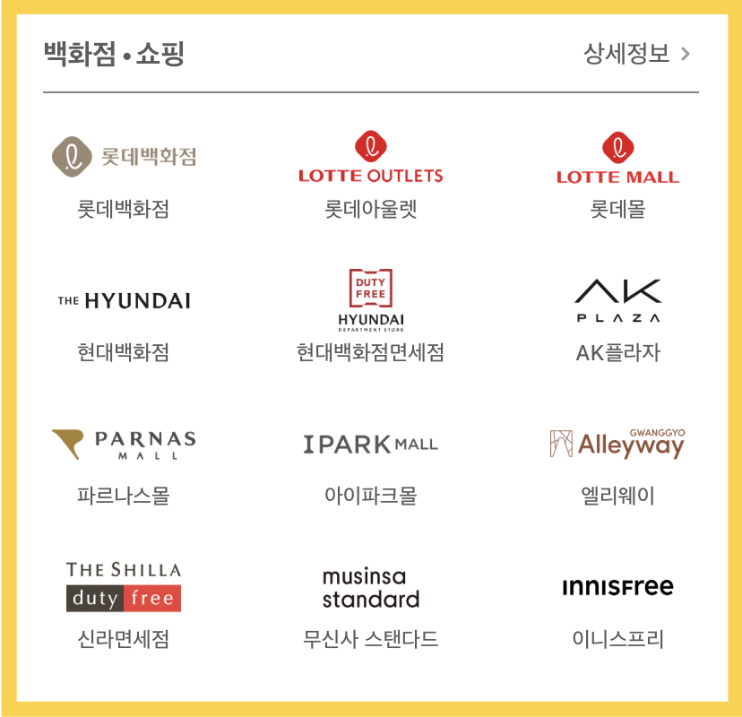 배달의민족, 무신사, 대한항공, 롯데ON, 버거킹, 폴바셋, 우리동네 GS, 현대홈쇼핑, 롯데시네마, 갤러리아몰, GS SHOP, GS 프레시몰, 도미노피자, 이니스프리, 텐바이텐, SRT Play, 현대이지웰