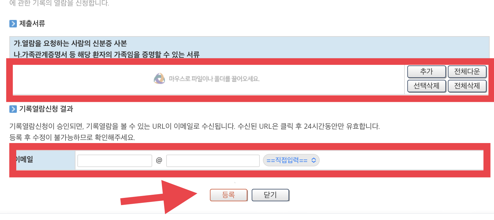 4. 마지막으로 기록열람신청 결과를 열어볼 수 있는 이메일주소를 입력한 후 등록을 마치면 됩니다.