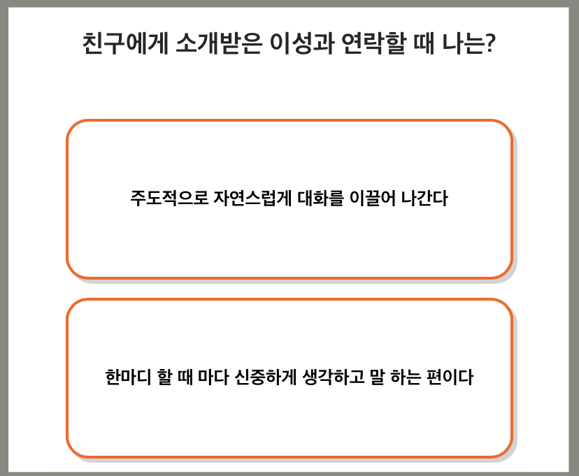 친구에게 소개받은 이성과 연락할 때 나는 주도적이기보다는 신중하게 생각하고 얘기하는 편에 속합니다. 상황에 따라서 조금씩 다르긴 하지만 대부분 생각을 먼저 한 다음 연락을 하거나 받은 연락에 대해서도 진중한 편인것 같습니다.