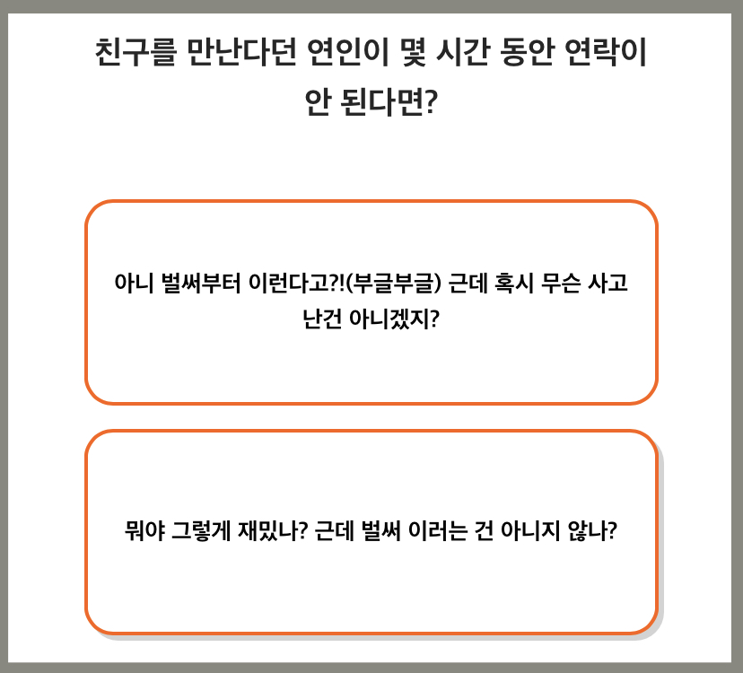 친구를 만난다던 연인이 몇 시간동안 연락이 안되면 무슨 일읹 궁금하고 혹시 큰 일이 벌어진건가 싶은 생각도 들것 같습니다.