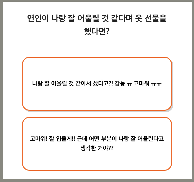 연인이 나랑 잘 너울릴 것 같다고 하면서 옷을 선물했다고 하면 완전 감동하면서 고맙다고 표현할 것 같습니다. 어디가 어울리는지도 궁금하지만 그건 나중에 천천히 물어볼 것 같은 느낌적인 느낌 ㅎㅎ