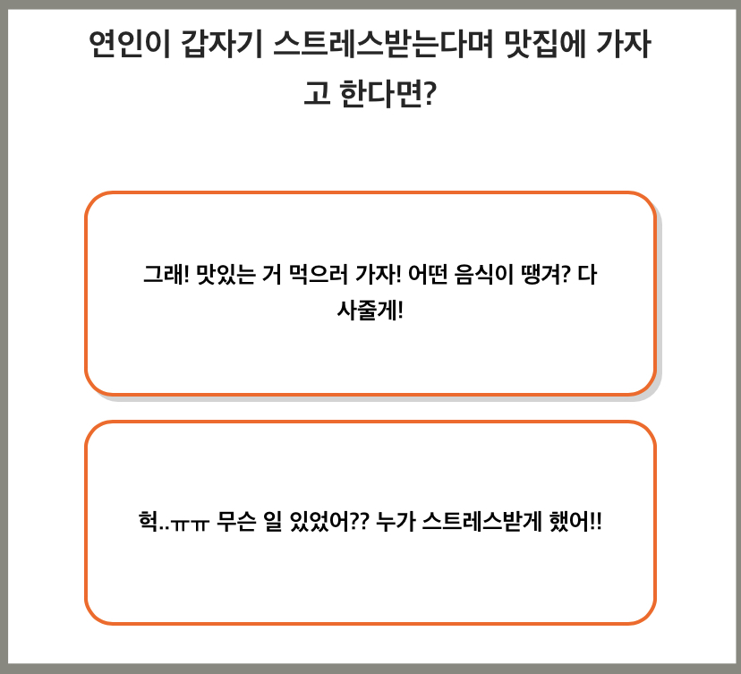 연인이 갑자기 스트레스받는다면서 맛집에 가자고 하면 무슨 일에 스트레스를 받았는지를 먼저 물어보고 상황 판단을 한 후에 맛집을 검색해서 찾아갈 것 같습니다.