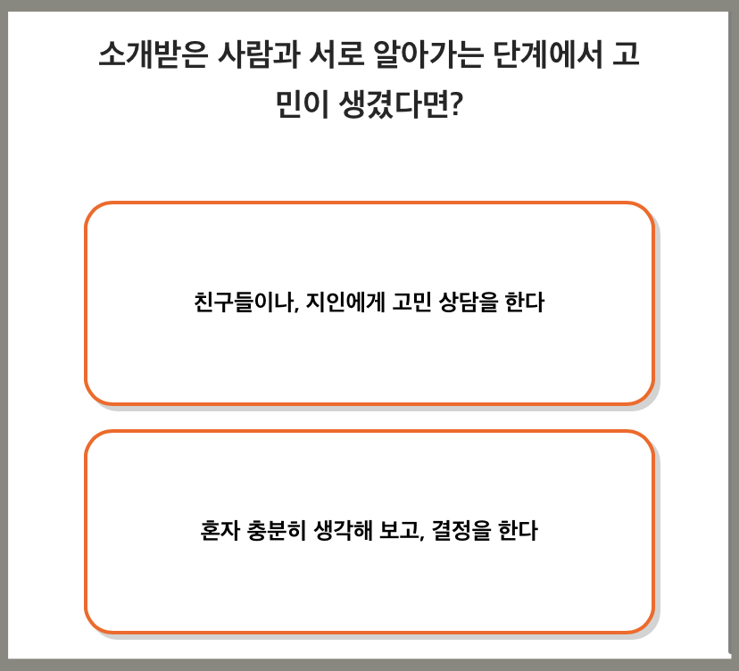 소개받은 사람과 서로 알아가는 단계에서 고민이 생겼다면 혼자 충분한 생각을 하고 결정하는데요. 고민 상담을 해도 끝내 결정하는 것은 스스로이기 때문입니다.