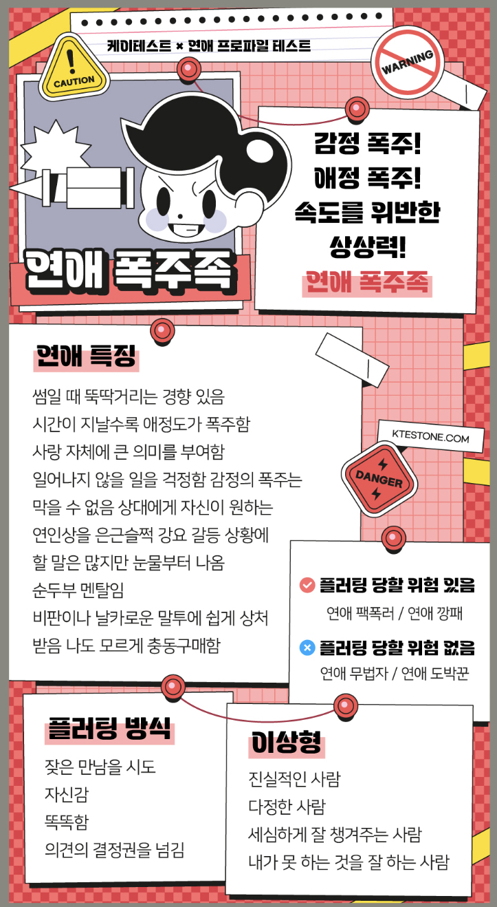 요즘 유행하는 mbti 테스트 중 연애관련 테스트가 나와서 관심을 받고 있습니다. 이름은 케이테스트에서 나온 연애프로파일 테스트인데요. 제목만 봐도 뭔가 심도있게 나의 연애 스타일을 분석해 줄 것 같은 그런 mbti 성격 테스트입니다. 그럼 재미있는 연애프로파일 테스트 mbti 성격테스트 결과 연애폭주족 링크에 대해 자세히 알아보도록 하겠습니다.