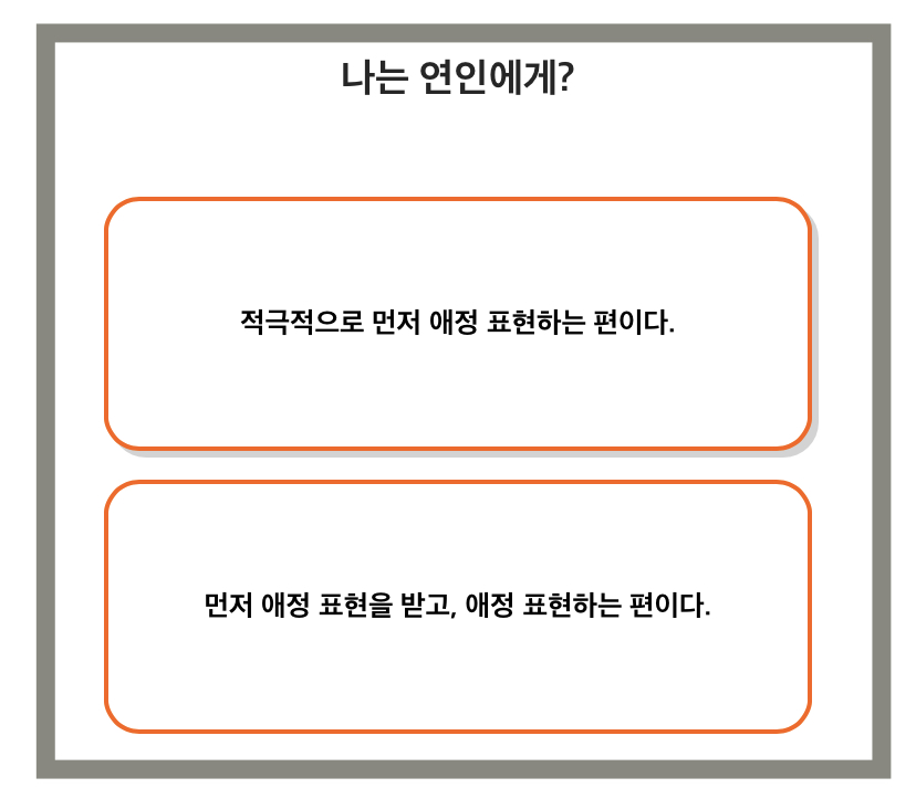 나는 연인에게 적극적이기 보다는 먼저 애정 표현을 받고 싶어하는 타입입니다. 그 다음에 저도 용기를 내어 애정 표현을 하는 경우가 많았습니다.