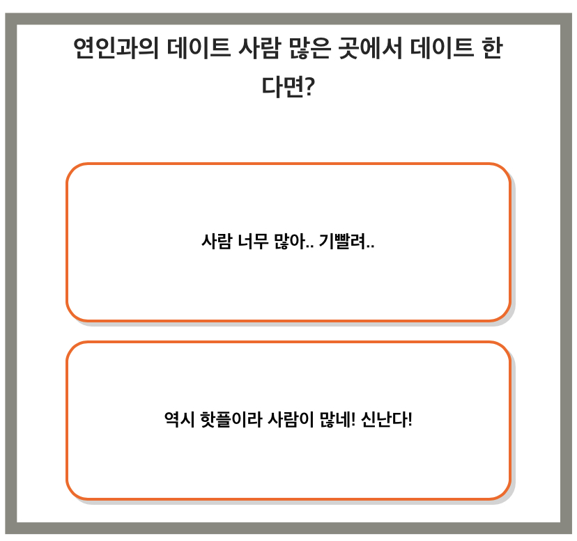 연인과의 데이트를 사람 많은 곳에서 한다면 저는 핫플이나 사람많은 곳을 좋아하기 때문에 무조건 오케이입니다.