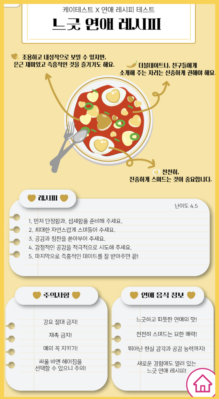 연애 레시피 테스트는 케이테스트에서 나온 따끈따끈한 mbti 성격 테스트입니다. 레시피와 주의사항 그리고 연애음식정보에 대해 확인해보도록 하겠습니다.