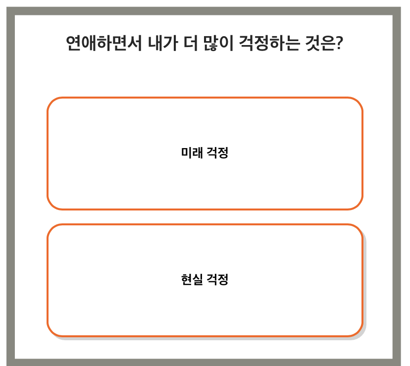 연애하면서 내가 더 많이 걱정하는 것은 현실 보다는 미래를 걱정하는 편입니다. 앞으로 우리는 어떤 계획을 세워서 어떤 식으로 지혜롭게 살아가야 할까 등을 고민합니다.