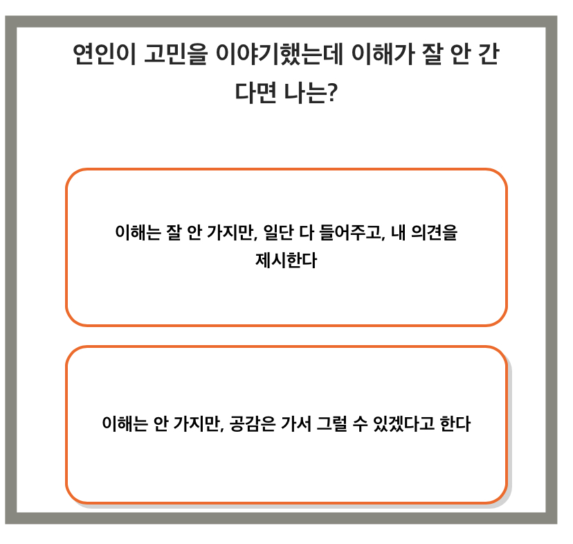 연인이 고민을 이야기 했는데 이해가 잘 안간다면이해능 안 가지만 공감은 가기 때문에 이야기를 끝까지 들어주는 편입니다. 이야기를 듣다보면 얼추 파악이 될 것이고 말을 하는 쪽도 이야기하면서 고민이 조금은 풀리지 않을까 하는 생각이기 때문입니다.