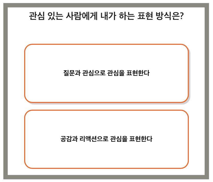 관심있는 사람에게는 공감하고 리액션으로 그 관심을 대신해서 표현했던 것 같습니다. 먼저 질문하거나 관심 표현하는 것이 서툽니다.