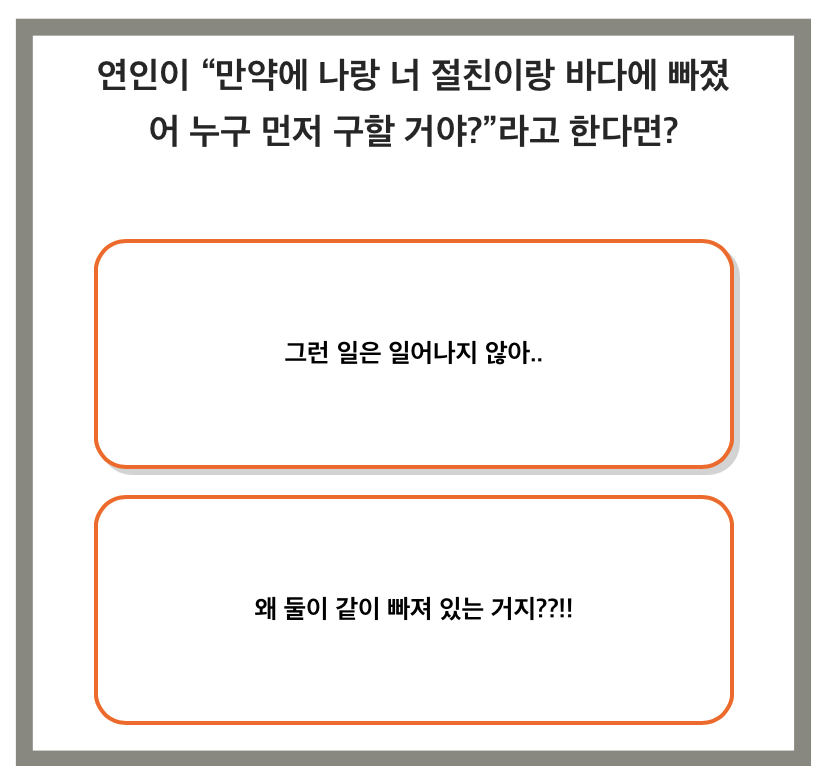 연인이 만약 나랑 너 절친이랑 바다에 빠졌어 누구 먼저 구할거냐고 물으면 그런 일은 일어날리가 없다고 말할 것 같습니다.
