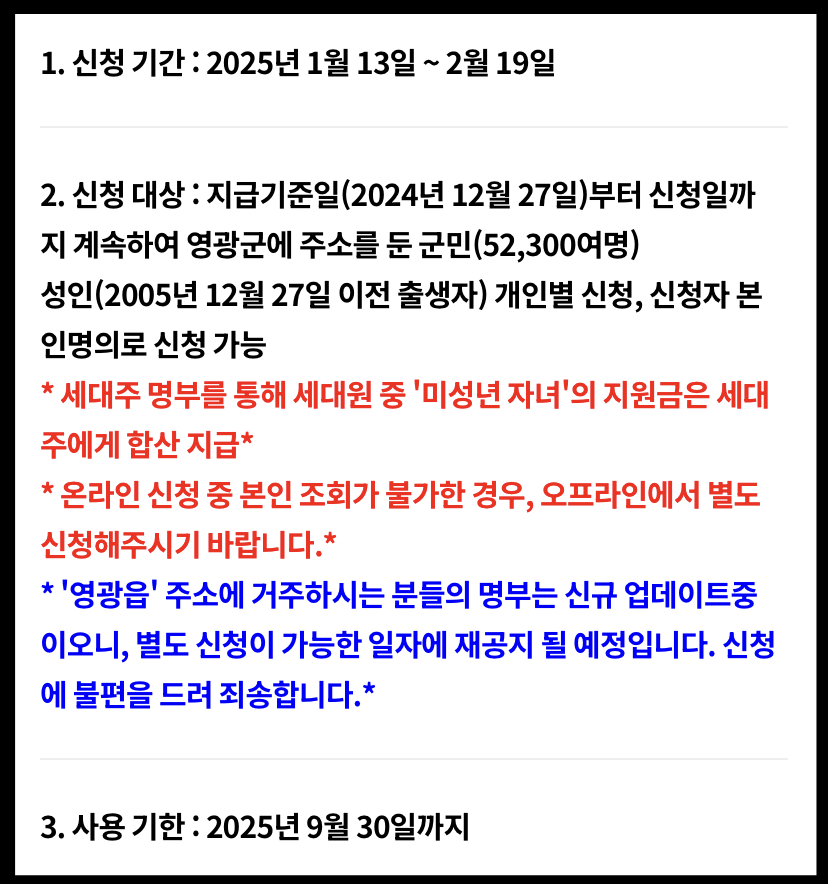 신청 대상은 지급 기준일인 2024년 12월 27일부터 신청일까지 계속해서 영광군에 주소를 둔 군민입니다.