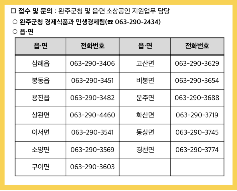 접수 및 문의: 완주군청 및 읍·면 소상공인 지원업무 담당