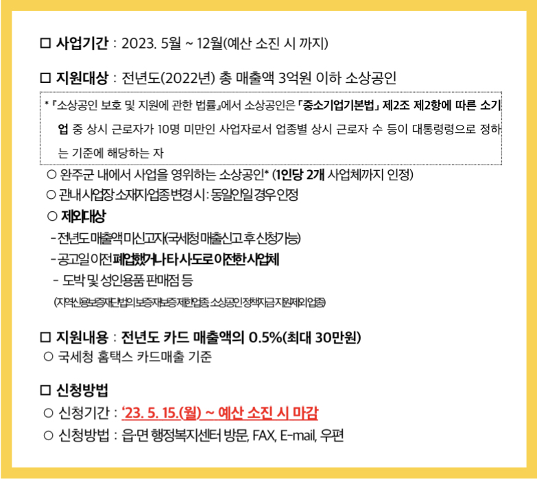 - 지원대상: 완주군 관내 소상공인, 전년도 및 당해 연도 완주군 내에서 사업을 영위하고 있는 소상공인