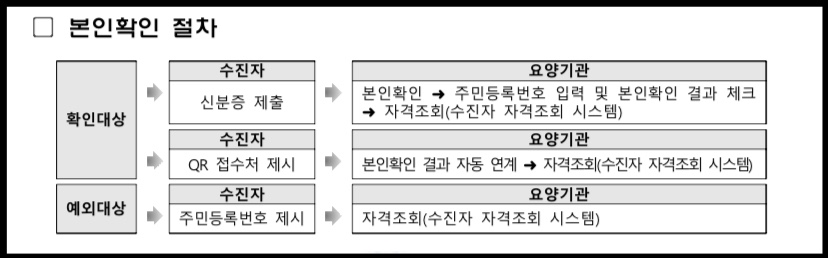 신분증 제출 > 요양기관(본인확인 > 주민등록번호 입록 및 본인확인 결과 체크 > 자격조회(수진자 자격조회 시스템)