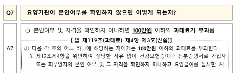 이를 위반해 환자가 적발되면 병원은 본인확인 의무를 다하지 않았다는 이유로 100만원 이하의 과태료를 물어야합니다. 이것은 국민건강보험법 개정에 따른 것으로, 미이행 시 최대 100만원의 과태료(1차 30만원, 2차 60만원, 3차 100만원)가 부과될 수 있는 강제사항입니다.
