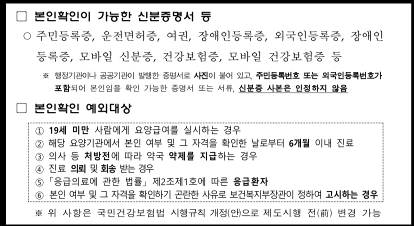 병원, 의원, 치과, 보건소, 한의원, 한방병원 등 기관은 환자가 찾아오면 건강보험을 적용하기에 앞서 신분증 등으로 본인 여부와 건강보험 자격 여부를 확인해야 합니다.