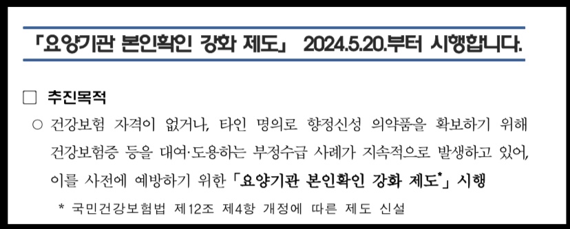 정부에서는 건강보험 자격이 없거나 타인의 명의로 향정신성 의약품을 확보하기 위해서 건강보험증을 대여하고 도용하는 사례를 방지하고자 국민건강보험법 제12조제4항을 개정하고 5월 20일부터 병의원에서 진료받고자 하는 환자의 신분증을 반드시 확인하는 요양기관 본인확인 강화제도를 시행합니다.