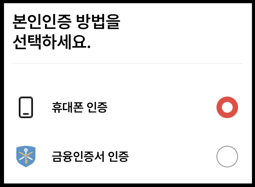 2. 설치 후 본인인증 수단 선택하여 인증합니다.
