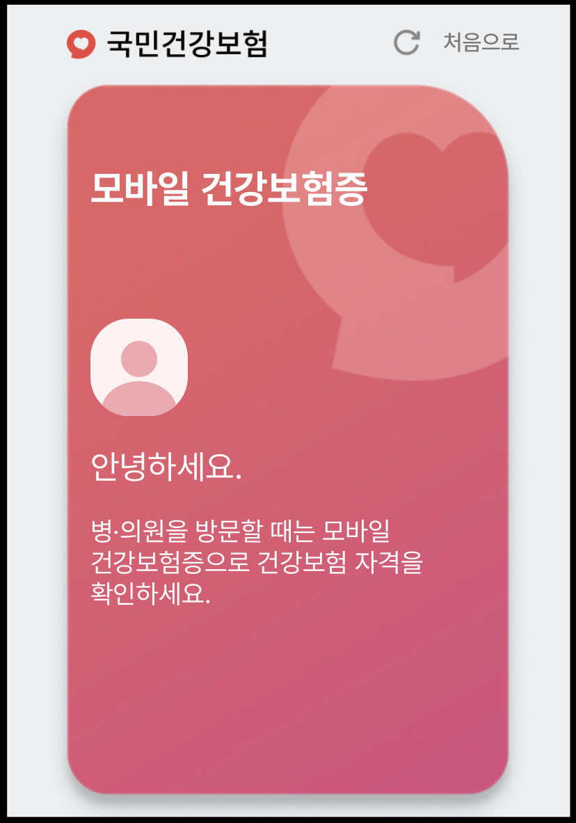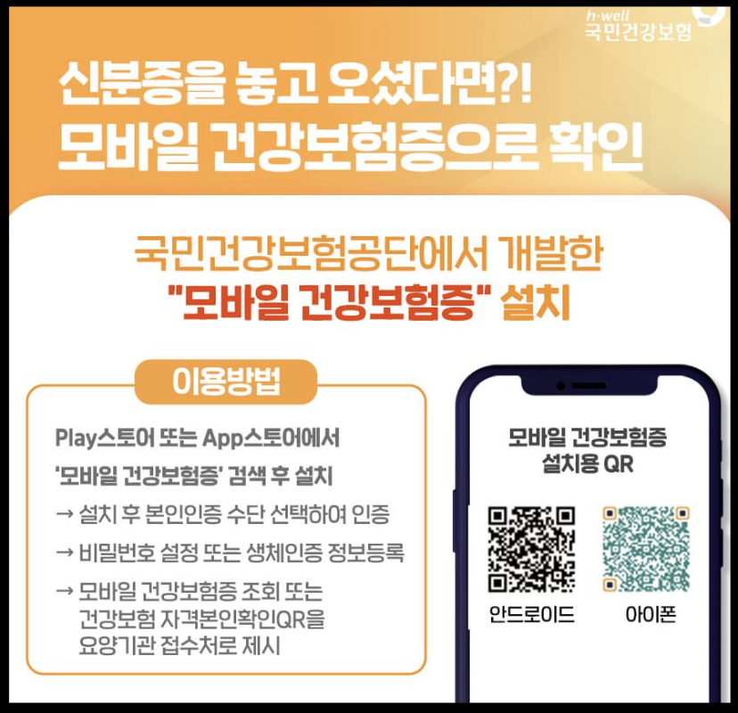 만약 신분증을 놓고왔다면 스마트폰을 활용해 국민건강보험공단에서 개발한 모바일 건강보험증을 설치하시면 됩니다.