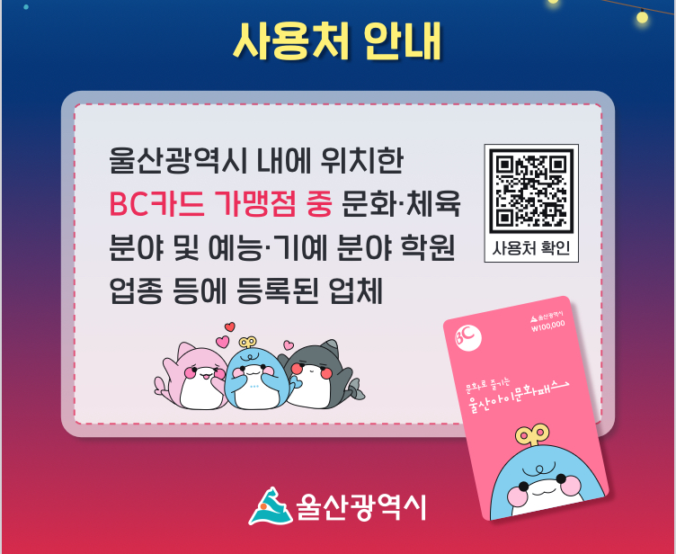 *울산아이문화패스카드의 사용처는 울산광역시 내에 위치한 BC카드 가맹점 중 문화 체육 분야 및 예능 기예 분야 학원 업종 등에 등록된 업체입니다. 아래 큐알코드를 스캔해서 확인하세요.