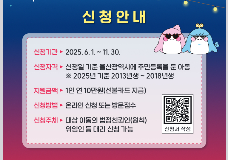 카드발급 대상은 신청일 기준 울산광역시에 주민등록을 둔 아동이며 2025년 기준 2013~2018년생 아동 전체입니다.