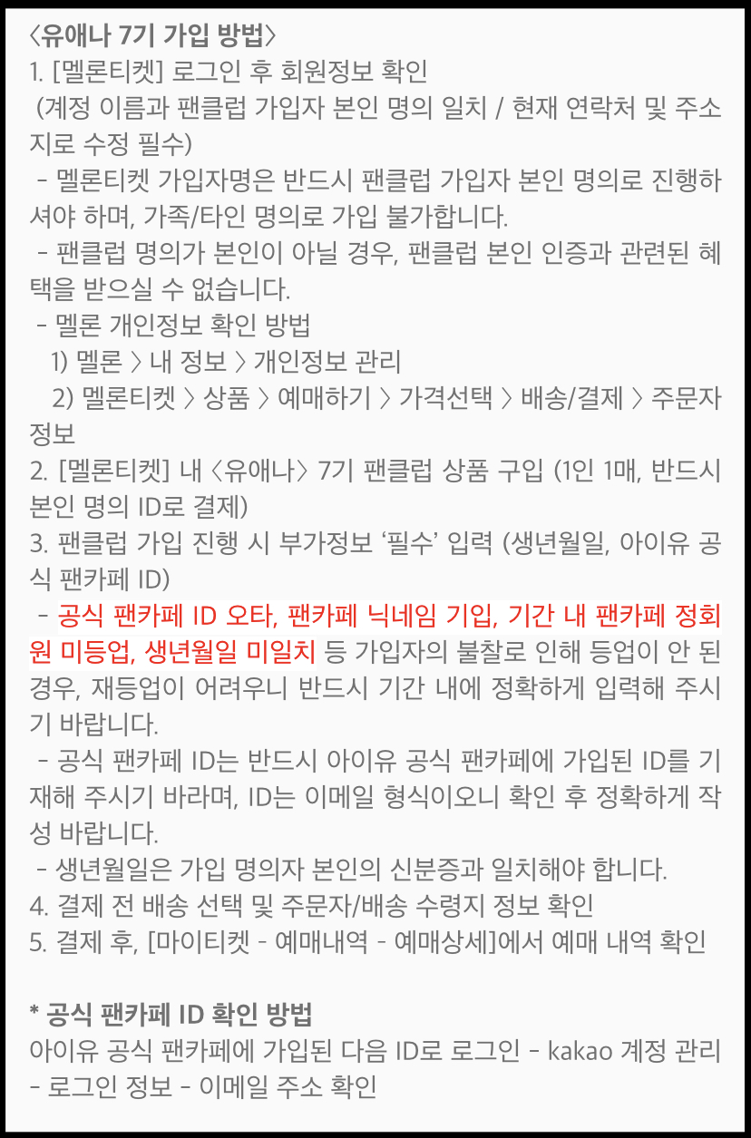 - 멜론티켓 가입자명은 반드시 팬클럽 가입자 본인 명의로 진행하셔야 하며, 가족/타인 명의로 가입 불가합니다.