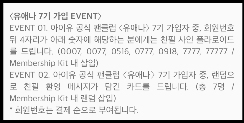 EVENT 01. 아이유 공식 팬클럽 유애나 7기 가입자 중, 회원번호 뒤 4자리가 아래 숫자에 해당하는 분에게는 친필 사인 폴라로이드를 드립니다.