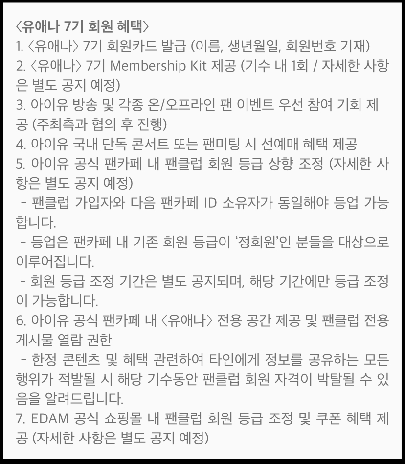- 아이유 공식 팬카페 내 유애나 전용 공간 제공 및 팬클럽 전용 게시물 열람 권한을 갖게됩니다. 한정 콘텐츠 및 혜택 관련하여 타인에게 정보를 공유하는 모든 행위가 적발될 시 해당 기수동안 팬클럽 회원 자격이 박탈될 수 있음을 알려드립니다.