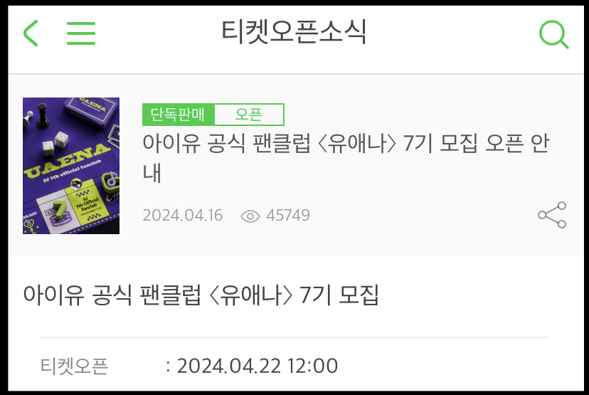 아이유 공식 팬클럽 유애나 7기 모집의 티켓오픈 날짜는 2024년 4월 22일 12:00입니다.