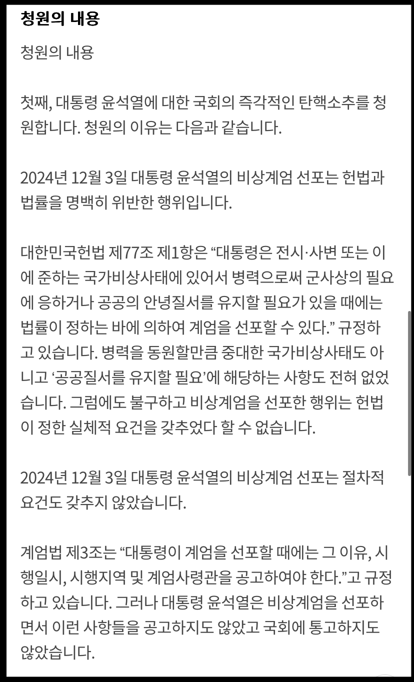 윤석열 탄핵소추와 내란법 수사 청원의 내용은 아래와 같습니다.