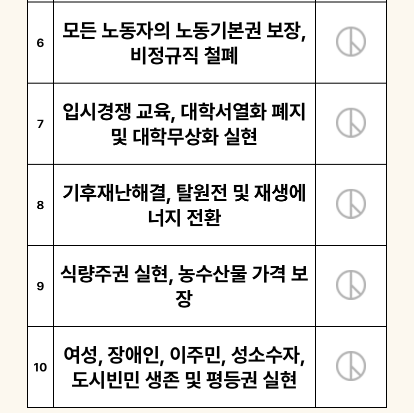- 여성, 장애인, 이주민, 성소수자, 도시빈민 생존 및 평등 권 실현