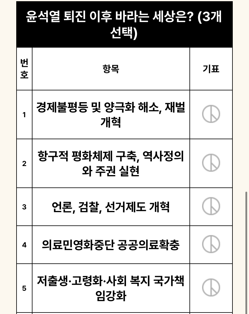 윤석열 ’퇴진 이후 바라는 세상은‘에서는 10개 중 3개를 고르시면 됩니다.