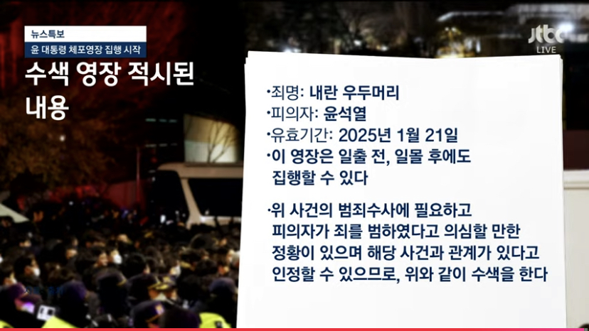 윤갑근 변호사는 정당한 공무집행이 아니다라며 영장에 형사소송법 110조·111조 예외 조항이 없고 모든 행위는 불법이고 내란에 해당한다고 주장했습니다. 이어 대통령은 헌법기관이라며 경찰을 향해 움직이지 말라고 말했습니다.