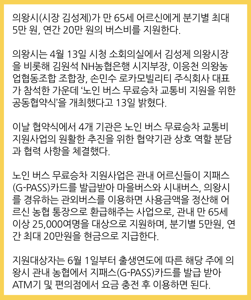 글을 마무리하며… 지금까지 의왕시 노인 버스 무료승차 교통비 신청방법에 대해 살펴봤습니다. 고물가 고유가 시대에 의왕시 노인분들이 교통비 부담을 덜고 좀 더 행복한 노후 생활을 누리시기 바랍니다.
