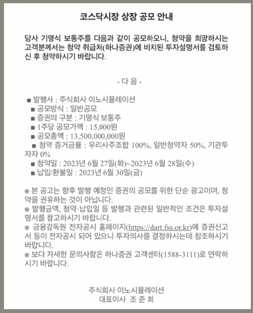 이노시뮬레이션의 일반 투자자 공모주 청약 기간은 6월 27일부터 28일에 진행됩니다. 상장 예정일은 7월 6일이며, 주관사는 하나증권입니다. 비대면 개설계좌는 당일계좌개설 후에도 청약이 가능하니 참고하시기 바랍니다.