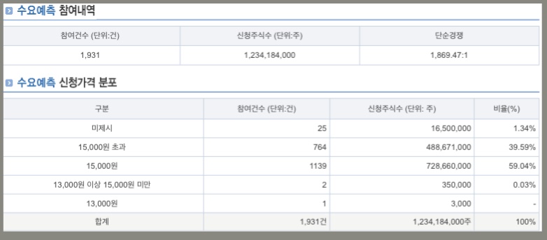 참여 기관 중 99.97%인 1928개 기관이 공모가 밴드 상단 이상 가격을 제시했고, 공모가는 최종적으로 희망밴드였던 1만3000~1만5000원에서 그 최상단인 1만5000원으로 확정했습니다. 상장 후의 시가총액은 1173억원 규모가 될 예정입니다.