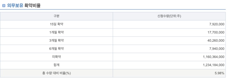 유통가능물량은 약 44.24%로 많은 편(평균 30%)이며, 의무보유 확약비율은 약 5.9%로 수요예측이 높은데 비해 낮은편입니다.