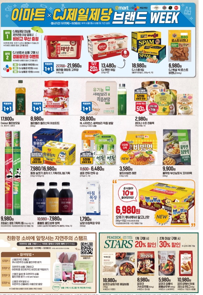 1+1제품으로는 태양초 고추장, coosur 올리브오일, 젤리벨리 젤리스틱 어쏘티드, 새싹보리 착즙분말, 마티니 스킨퍼퓸 샴푸, 크리넥스 울트라클린 아쿠아 더블롱 비데3겹 화장지, 오랄비 아이콘X칫솔 등 입니다.