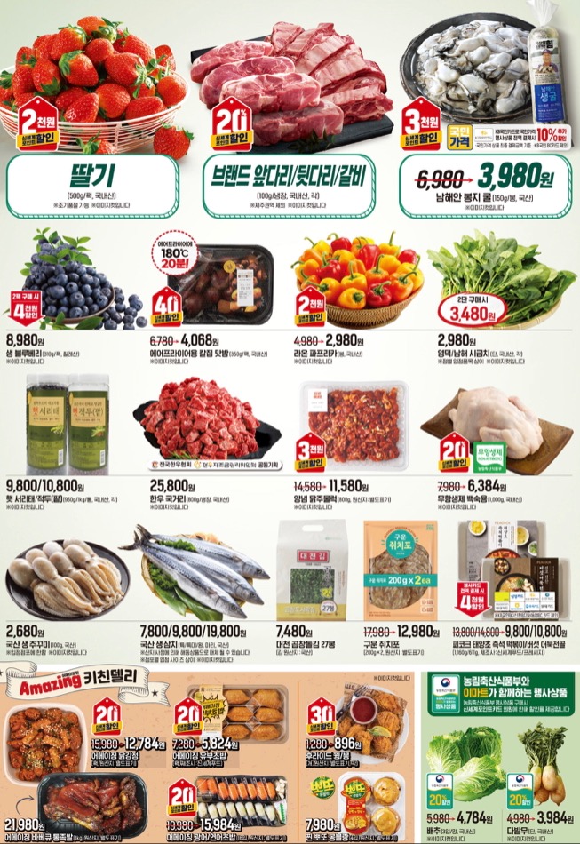 이마트 키친델리 상품 중 어메이징 닭강정, 어메이징 유뷰초밥, 어메이징 광어·연어초밥은 11월 24일부터 30일까지 신세계포인트 적립 시 20% 할인된 가격에 구매가 가능합니다. 후라이드 윙·봉은 신세계포인트 적립 시 30% 할인 판매합니다.
