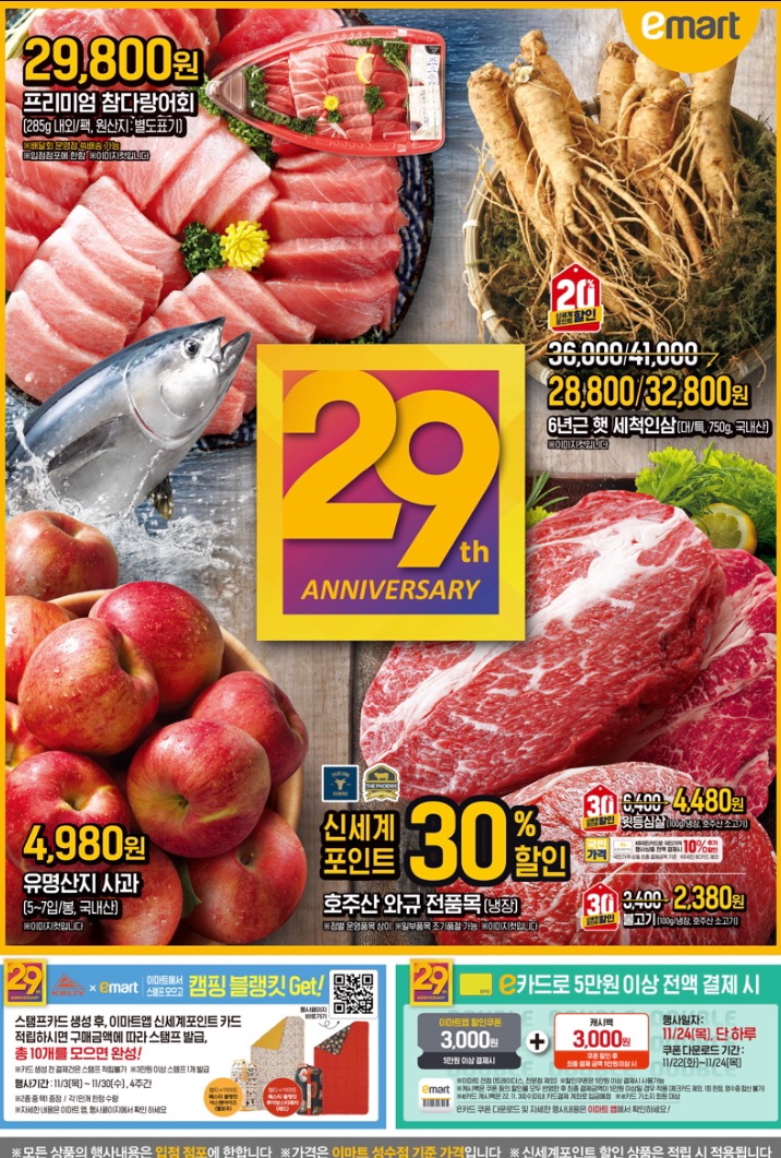 이번 29주년 행사 이벤트로는 참다랑어회, 햇 인삼, 소고기 등 보양 신선식품, 가공 및 생활용품 1+1 등 다양한 제품할인을 통해 고객분들께 혜택을 드립니다.